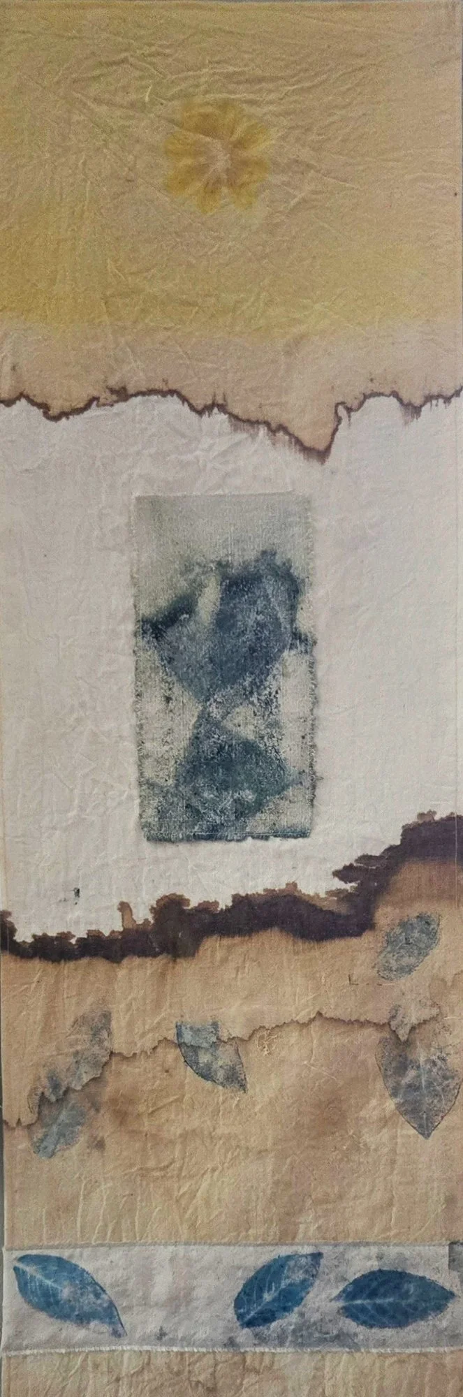 Natural dye processes often reveal singular patterns and colors. The flood like patterns here occur when dry fabric strips are left to slowly soak up dye made from coreopsis flowers. The fire colors—yellow, orange and red—are created by combining coreopsis dye and –appropriately--wood ash. The dye chemistry seems to speak: “Flood and Fire!” Perhaps it is nature’s warning. Perhaps it is nature’s plea.